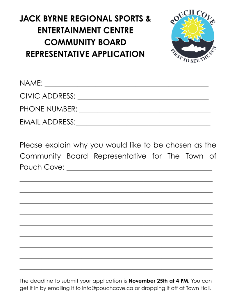 The Town of Pouch Cove is seeking a NEW Jack Byrne Regional Sports and Entertainment Centre Community Representative! If you are interested in applying, fill out the application form and submit by November 25th at 4:00 pm to [email protected]