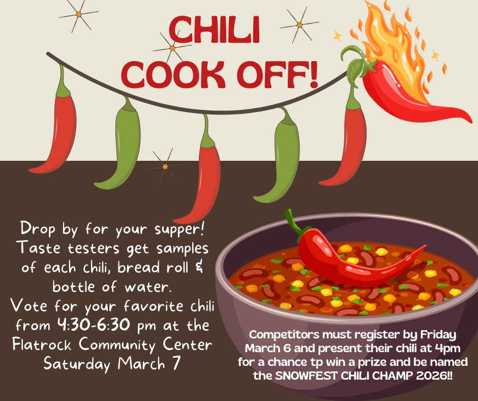 All participants will be asked to bring their chili to the Flatrock Community Center for 4pm