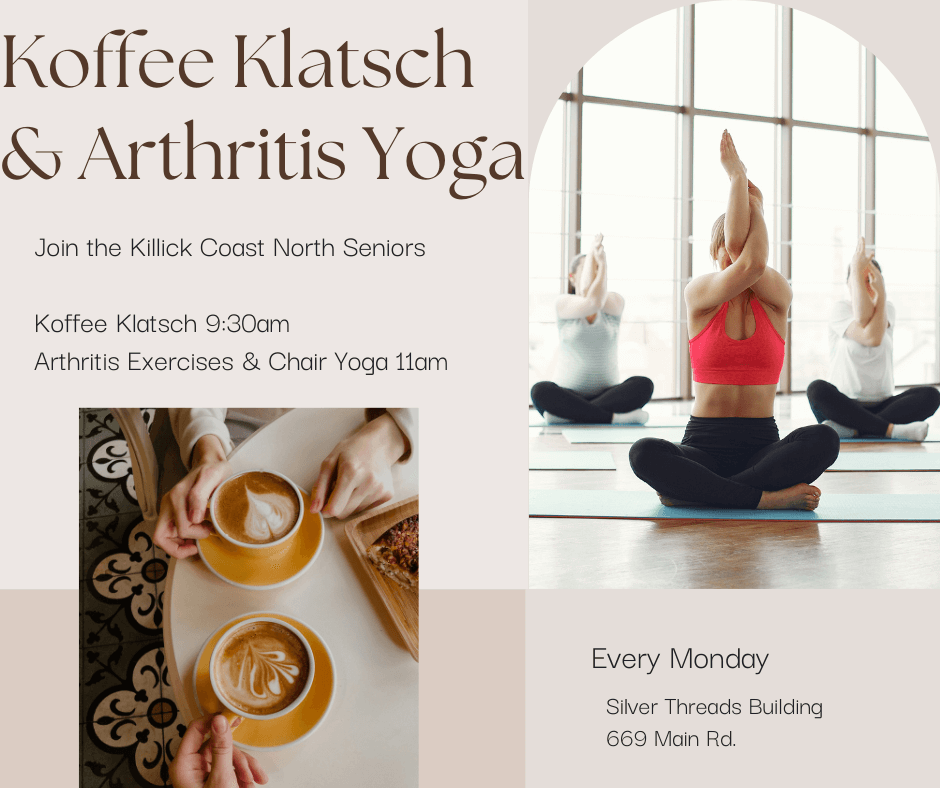 Join the Killick Coast North Seniors for their weekly Koffee Klatsch from 9:30-10:45, followed by Arthritis Exercises & Chair Yoga at 11am