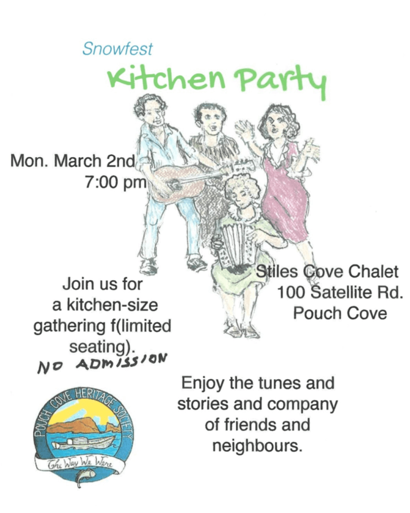 Join the Pouch Cove Heritage Society for a Snowfest Kitchen Party at Stiles Cove Chalet 7pm